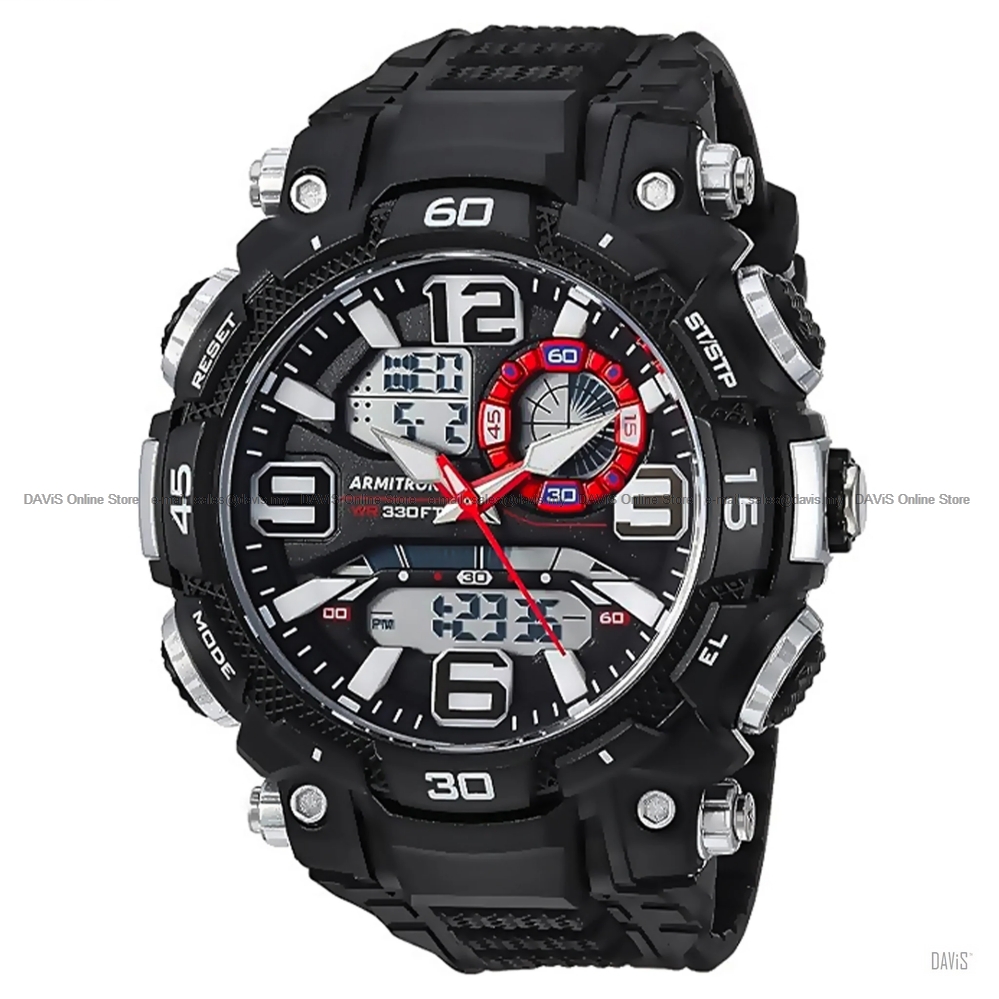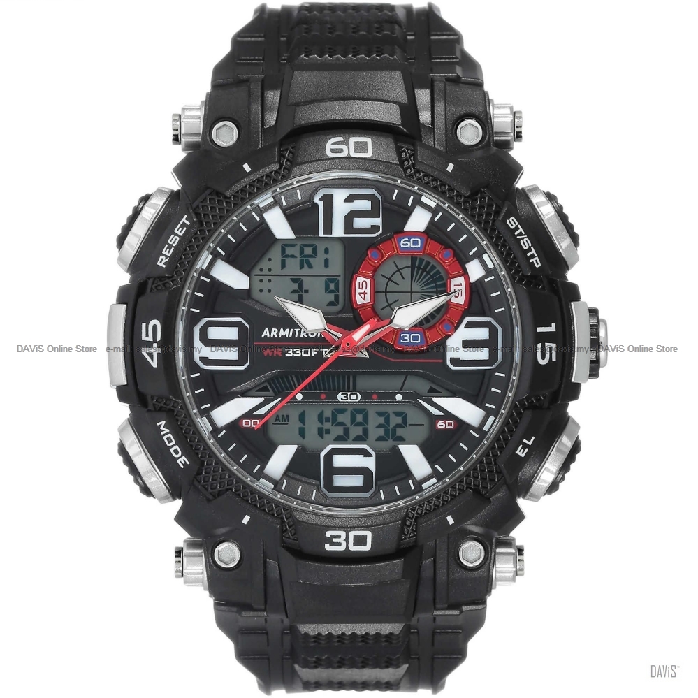 Product Details: Sporty and stylish, this Armitron analog-digital watch can take you from workout to night out. The display includes the time, seconds, day, and date, and has chronograph, lap time, alarm, and military time functionalities. Case Shape: Round Warranty: