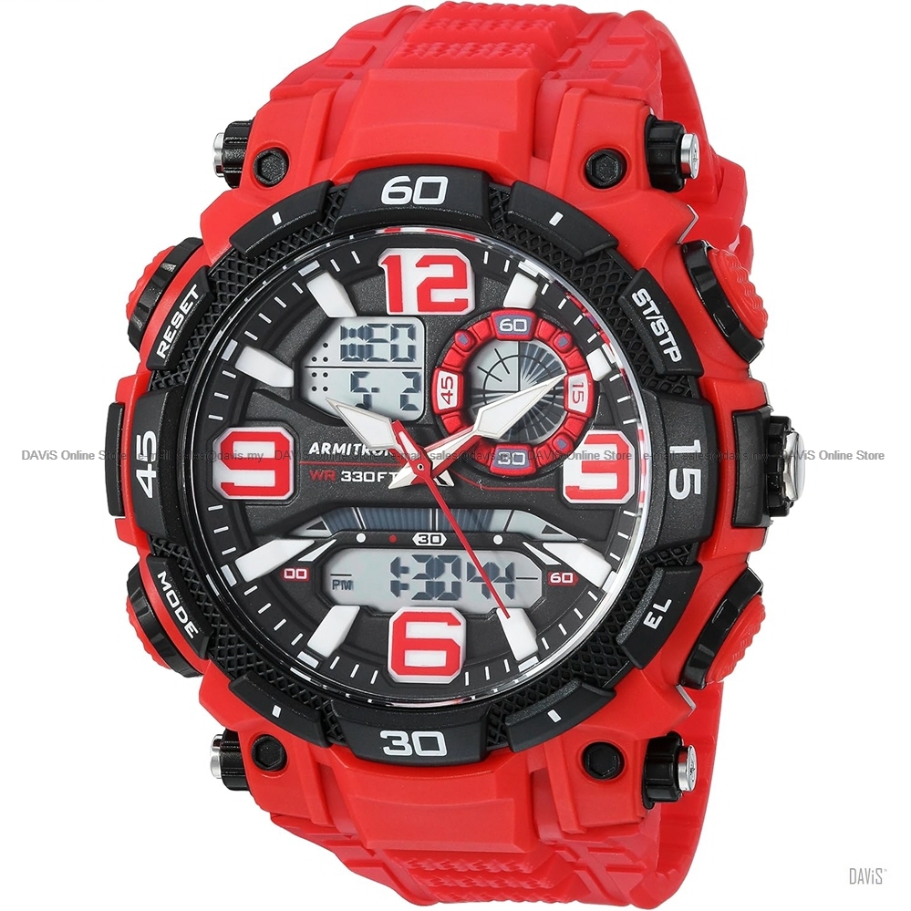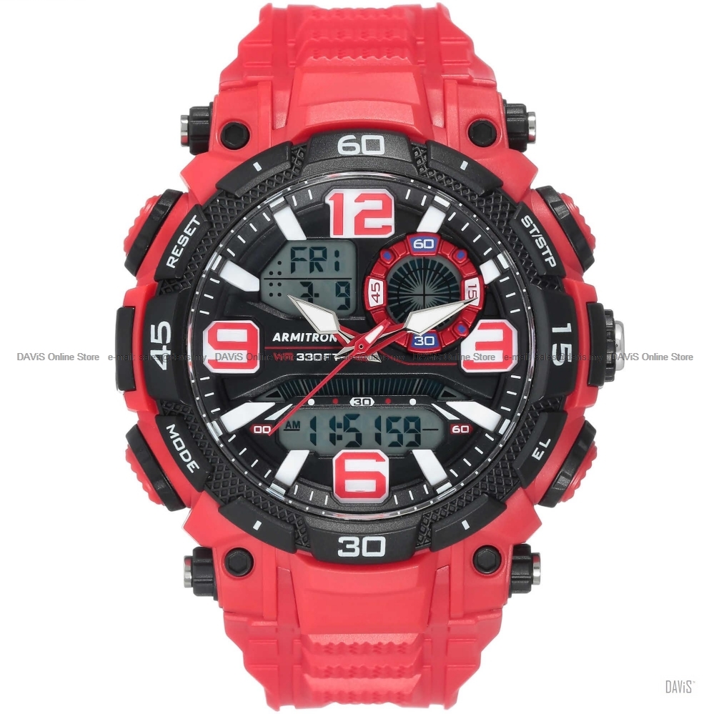 Product Details: Sporty and stylish, this Armitron analog-digital watch can take you from workout to night out. The display includes the time, seconds, day, and date, and has chronograph, lap time, alarm, and military time functionalities. Case Shape: Round Warranty: