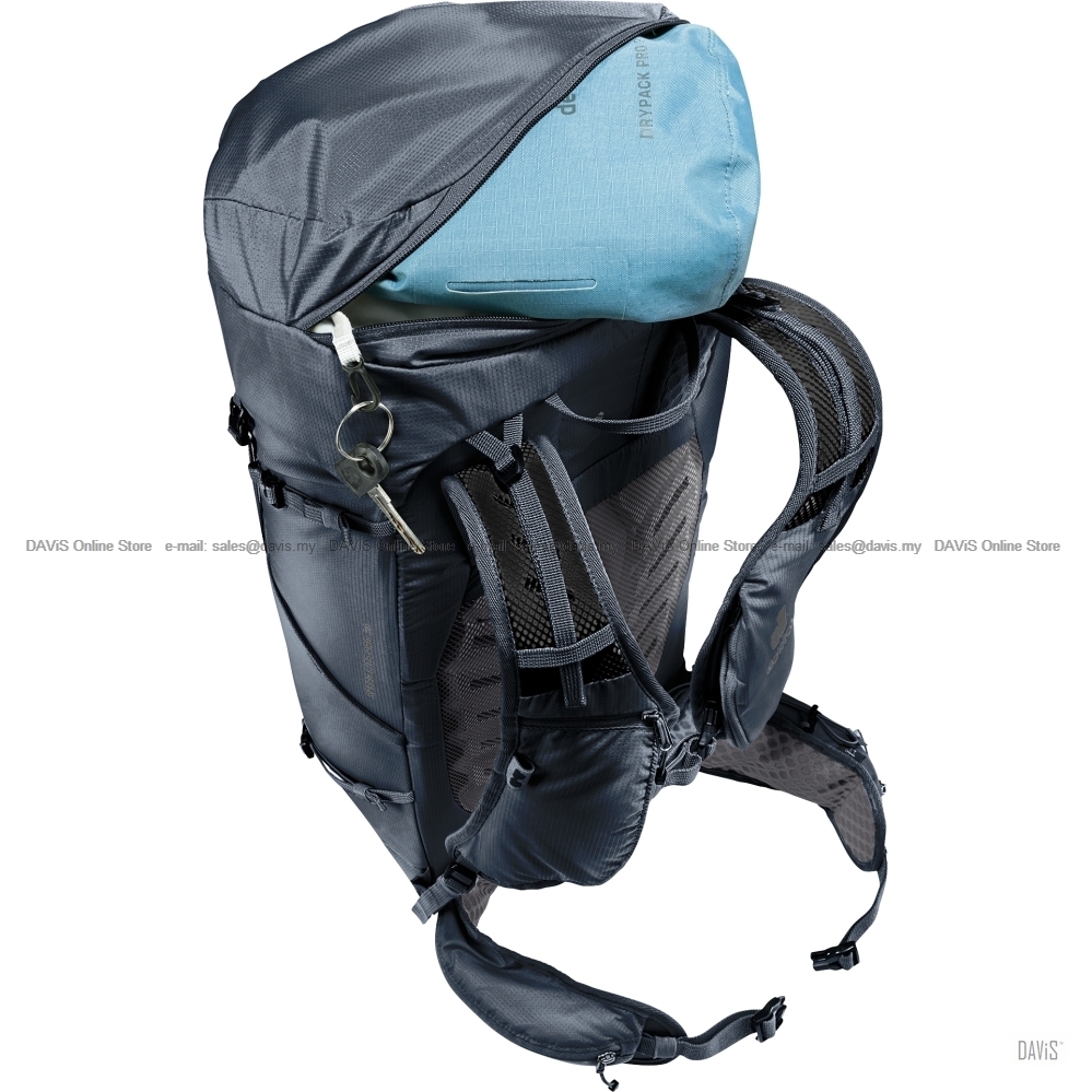 This webpage is best viewed at 1280 x 1024 Resolution Product Description: Move fast & light through the mountains – as well as comfortably – with this featherweight speed hiking backpack. Its vest-style perforated shoulder straps, supple hip fins, 2-way adjustable sternum strap and deuter LiteAir back system combine to create good ventilation and a snug, compact fit. Handy pockets on the shoulder straps and hip fins, a spacious lid compartment plus quick-release pole attachments, provide fast on-the-move access without having to take off the pack. Your optimal companion for Features Specification Material LITEAIR Balanced load distribution The benefits Made without PFAS PFAS is used, among other things, as a coating for rain protection, as they have water, dirt and grease-repellent properties. Instead, deuter now uses DWR (Durable Water Repellency) impregnation, which is harmless to health and environmentally friendly. Green Button certified product ClimatePartner certified product bluesign® product The shell fabrics are made of 100% recycled yarn Warranty: Shipping & Handling: