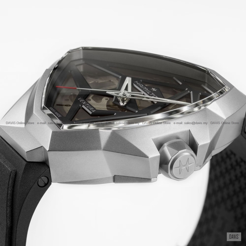 Product Description: Defying convention, the Ventura Edge Skeleton takes a bold leap into the future of watchmaking. Breaking away from the iconic triangular Ventura case structure, it introduces a daring new architectural design. Dark, enigmatic, and radically designed, this timepiece plays with shadow and light, framed by a contrasting silver steel case for added drama. At its heart is the H-10-S movement, revealed incrementally by a gradient effect skeletonized dial. This timepiece comes fitted with a black rubber strap. Specifications Collection Movement Case size Thickness (mm) Dial color Case material Crystal Lug width Power reserve Water Resistance Anti Reflection Open Case Back Nivachron Super Luminova Strap reference Strap type Buckle type Buckle width Movement Hamilton Two-Year Warranty LIMITED TWO-YEARS WARRANTY Your HAMILTON® watch is warranted by Hamilton International Ltd. for a period of twenty-four (24) months from the date of purchase under the terms and conditions of this warranty. The international HAMILTON warranty covers material and manufacturing defects existing at the time of delivery of the purchased HAMILTON watch. The warranty only comes into force if the warranty certificate is dated, fully and correctly completed and stamped by an official HAMILTON dealer. During the warranty period and by presenting the valid warranty certificate, you will have the right to have any defect repaired free of charge. In the event that repairs are improper to restore the normal conditions of use of your HAMILTON watch, Hamilton International Ltd. guarantees its replacement by a HAMILTON watch of identical or similar characteristics. The warranty for the replacement watch ends twenty-four (24) months after the date of purchase of the replaced watch.