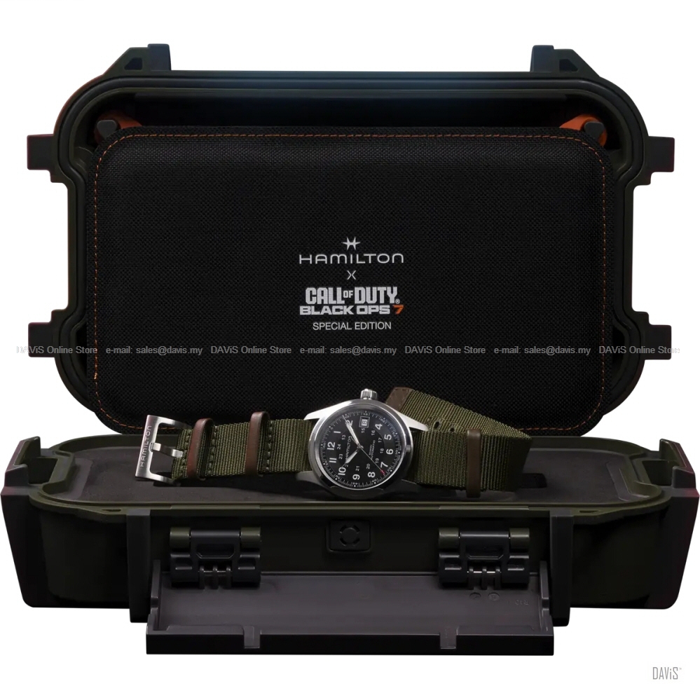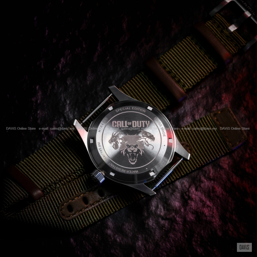 Product Description: Hamilton teams up with Call of Duty to launch a special edition watch, featured in-game and available in real life for true fans. EMBRACE THE MADNESS The year is 2035 and the world is on the brink of chaos, ravaged by violent conflict and psychological warfare. David Mason leads an elite JSOC team on a covert mission to the sprawling Mediterranean city of Avalon. GAME ON Strapped to the wrist of the operator Vermaak, the Khaki Field Auto Call of Duty Special Edition isn't just for telling time. It's a mark of precision and style. Keep an eye out in Multiplayer, where Vermaak brings the heat... and the watch. SPECIAL EDITION CASEBACK H-10 CALIBER COLLECTOR BOX Diameter: 38 mm Hamilton Two-Year Warranty LIMITED TWO-YEARS WARRANTY Your HAMILTON® watch is warranted by Hamilton International Ltd. for a period of twenty-four (24) months from the date of purchase under the terms and conditions of this warranty. The international HAMILTON warranty covers material and manufacturing defects existing at the time of delivery of the purchased HAMILTON watch. The warranty only comes into force if the warranty certificate is dated, fully and correctly completed and stamped by an official HAMILTON dealer. During the warranty period and by presenting the valid warranty certificate, you will have the right to have any defect repaired free of charge. In the event that repairs are improper to restore the normal conditions of use of your HAMILTON watch, Hamilton International Ltd. guarantees its replacement by a HAMILTON watch of identical or similar characteristics. The warranty for the replacement watch ends twenty-four (24) months after the date of purchase of the replaced watch.