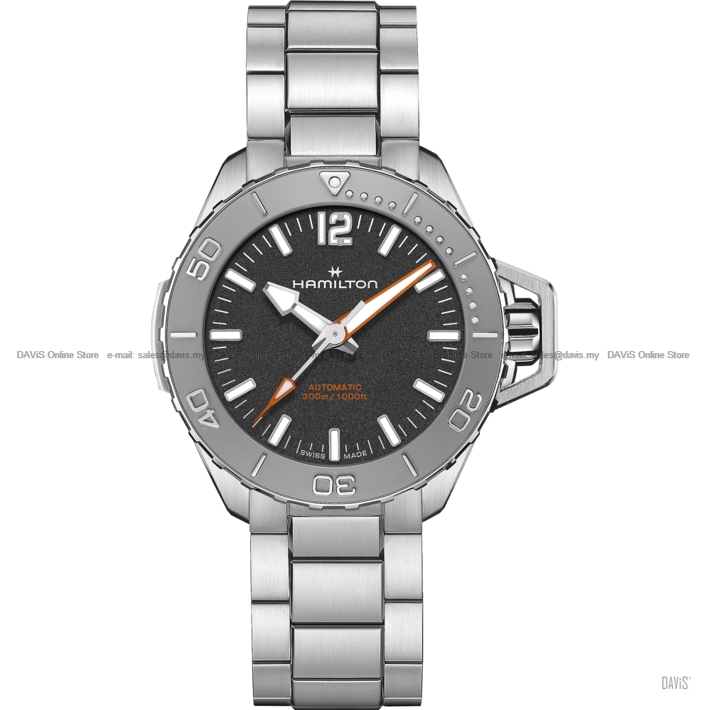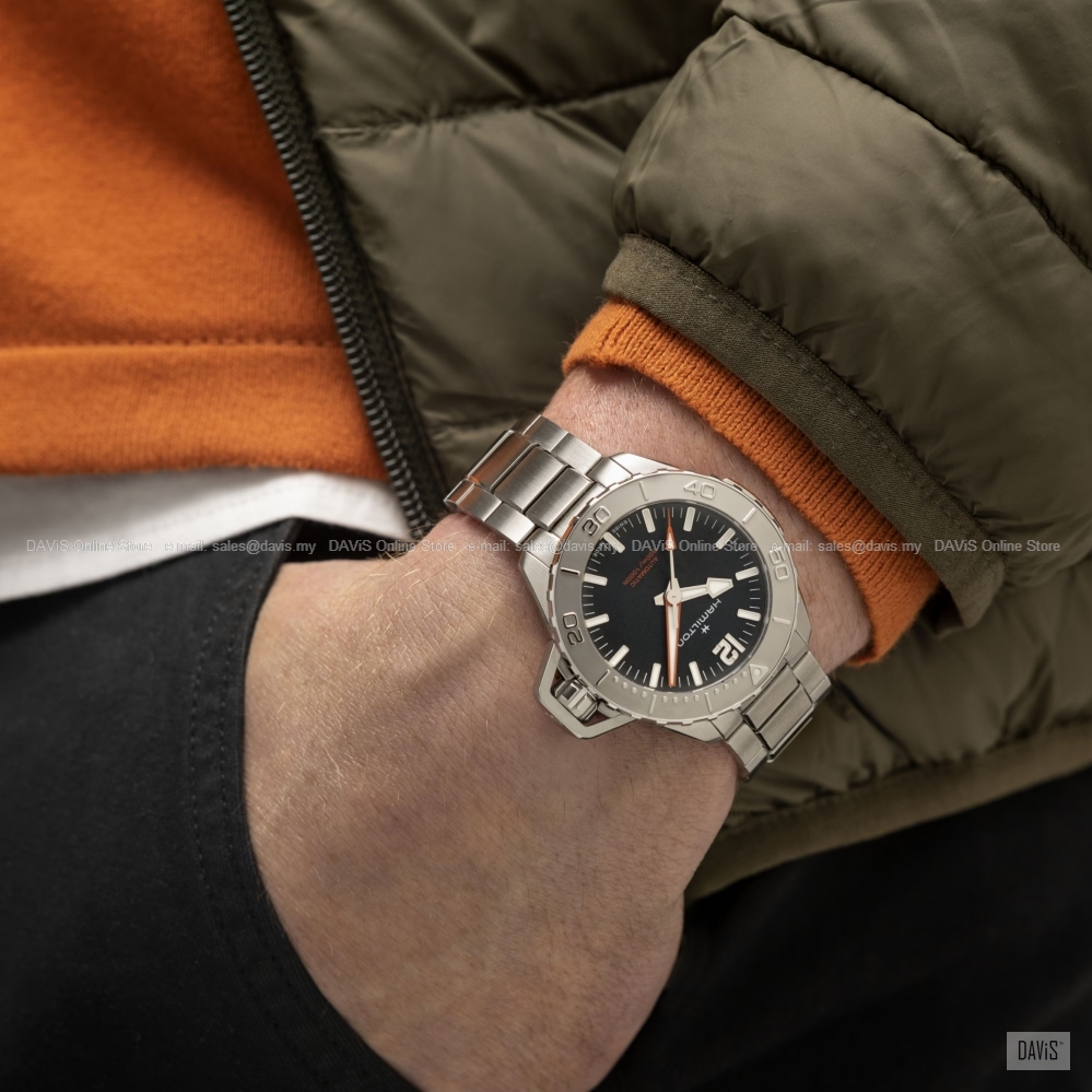 Product Description: The Khaki Navy Frogman Automatic stands out for its technical performance and distinctive look. Its 41mm stainless steel case features a screw-down crown protected by a robust bridge-shaped crown guard to ensure its 30 bar (300m) water-resistance, a nod to the original Frogman’s design. Boasting a black dial with touches of Super-LumiNova® to ensure precise readings under any circumstances, this 41mm Khaki Navy Frogman Automatic is fitted with an imposing stainless steel bracelet. Functional and wearable at once, this timepiece is a hero underwater and on land. Specifications Collection Movement Case size Thickness (mm) Dial color Case material Crystal Lug width Power reserve Water Resistance Screw Down Crown Nivachron Strap reference Strap type Buckle type Buckle width Movement Hamilton Two-Year Warranty LIMITED TWO-YEARS WARRANTY Your HAMILTON® watch is warranted by Hamilton International Ltd. for a period of twenty-four (24) months from the date of purchase under the terms and conditions of this warranty. The international HAMILTON warranty covers material and manufacturing defects existing at the time of delivery of the purchased HAMILTON watch. The warranty only comes into force if the warranty certificate is dated, fully and correctly completed and stamped by an official HAMILTON dealer. During the warranty period and by presenting the valid warranty certificate, you will have the right to have any defect repaired free of charge. In the event that repairs are improper to restore the normal conditions of use of your HAMILTON watch, Hamilton International Ltd. guarantees its replacement by a HAMILTON watch of identical or similar characteristics. The warranty for the replacement watch ends twenty-four (24) months after the date of purchase of the replaced watch.
