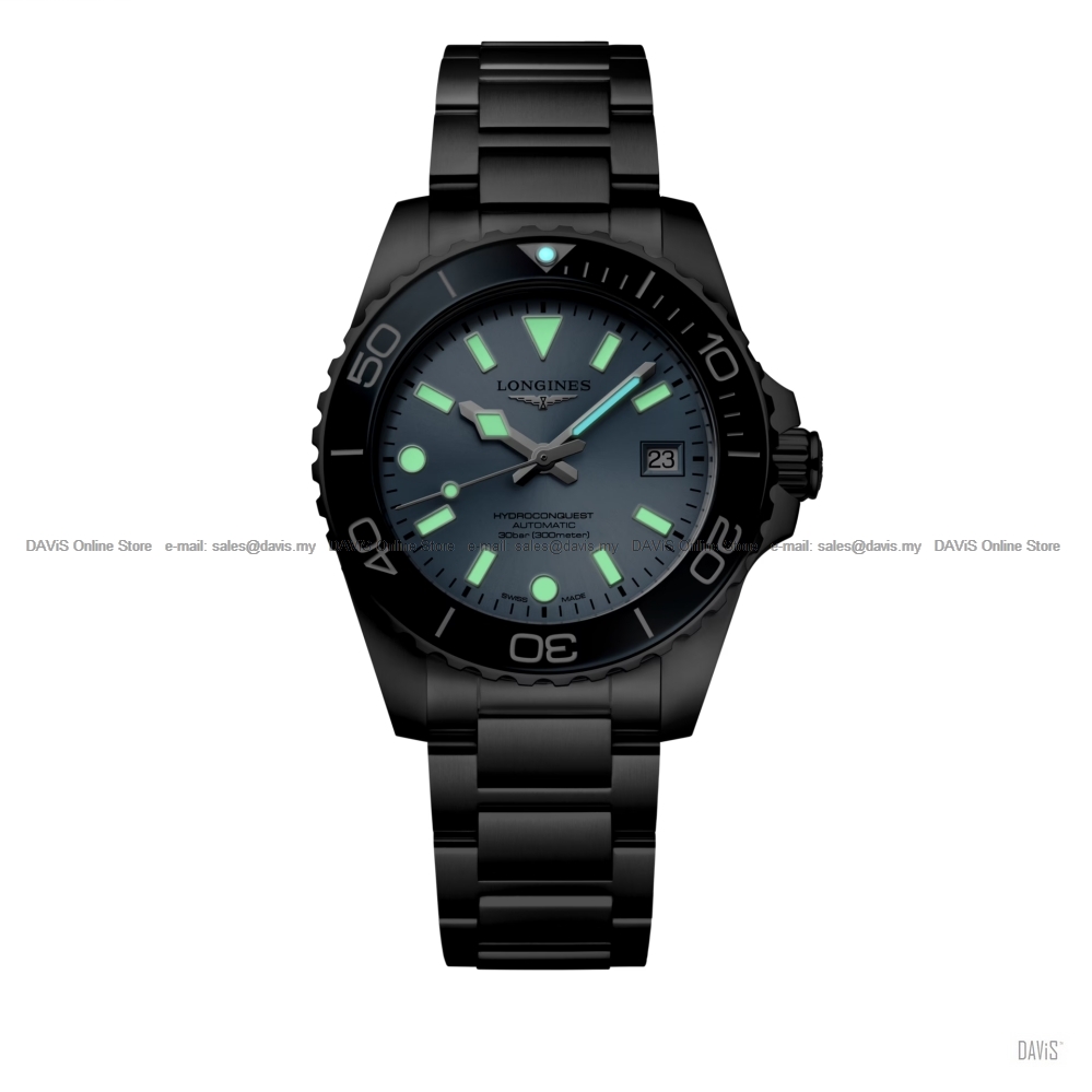 Product Description: The HYDROCONQUEST collection blends modern aesthetics with proven performance. Powered by an exclusive LONGINES automatic calibre, water-resistant up to 30 bar (300 m), with unidirectional bezel, screw-in crown and screw-down case back. Date, self-winding mechanical movement beating at 25'200 vibrations per hour, with a monocrystalline silicon balance-spring power reserve up to 72 hours. Screw-in crown unidirectional rotating bezel, water-resistant to 30 bar, scratch-resistant sapphire crystal, with several layers of anti-reflective coating on both sides. Frosted blue sunray dial, swiss super-luminova®. Stainless steel bracelet, with double security folding clasp with micro adjustment system. CASE Material Glass Case Back Dimension Lug distance Lug-to-lug Thickness Water Resistance Case Specificities Weight DIAL & HANDS Hour markers Hands Specificities MOVEMENT & FUNCTIONS Functions Caliber Movement Description STRAP Buckle GENERAL Warranty: