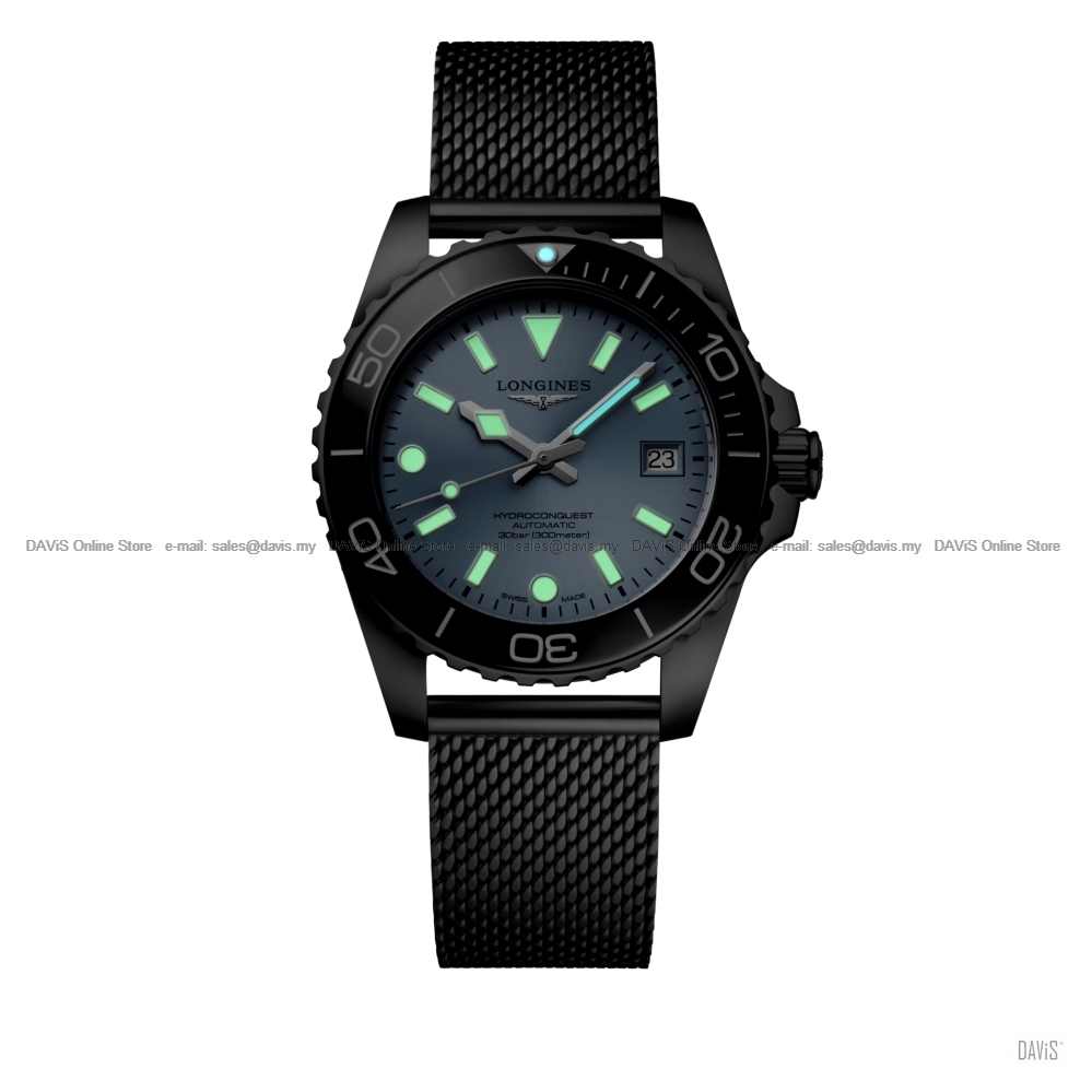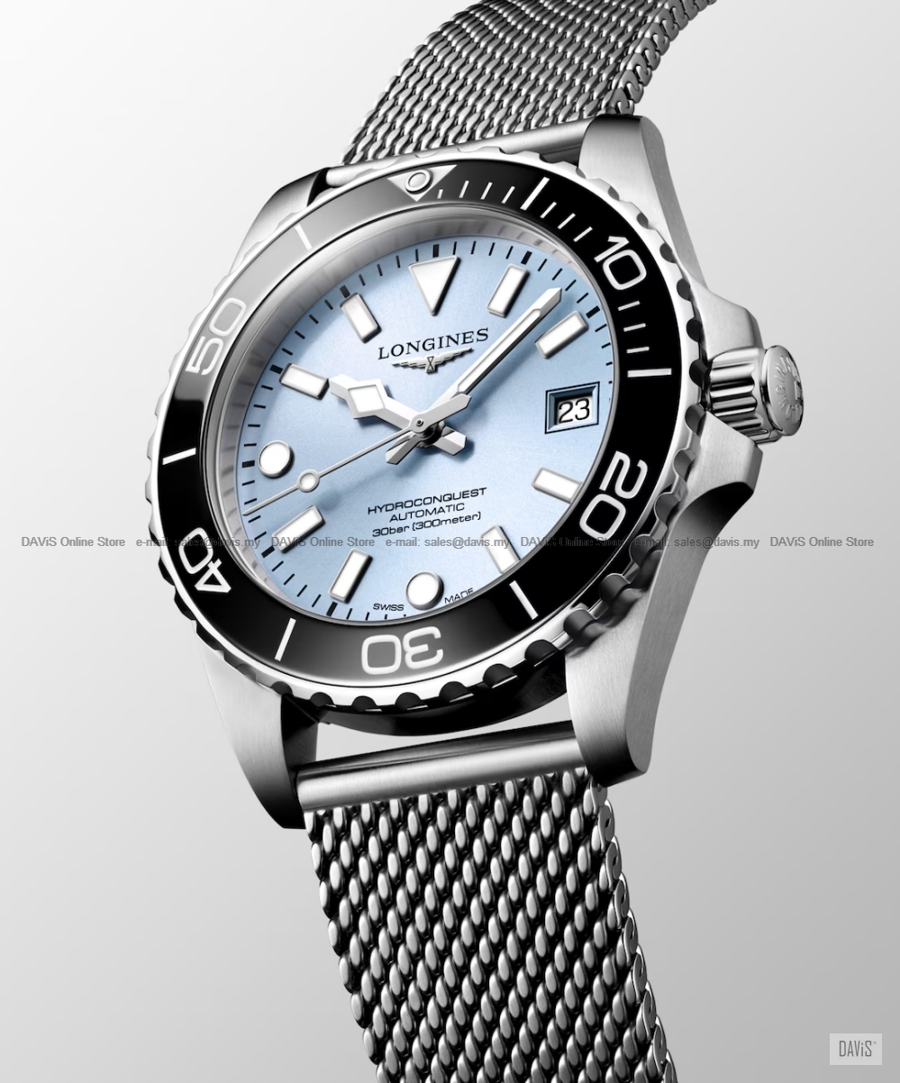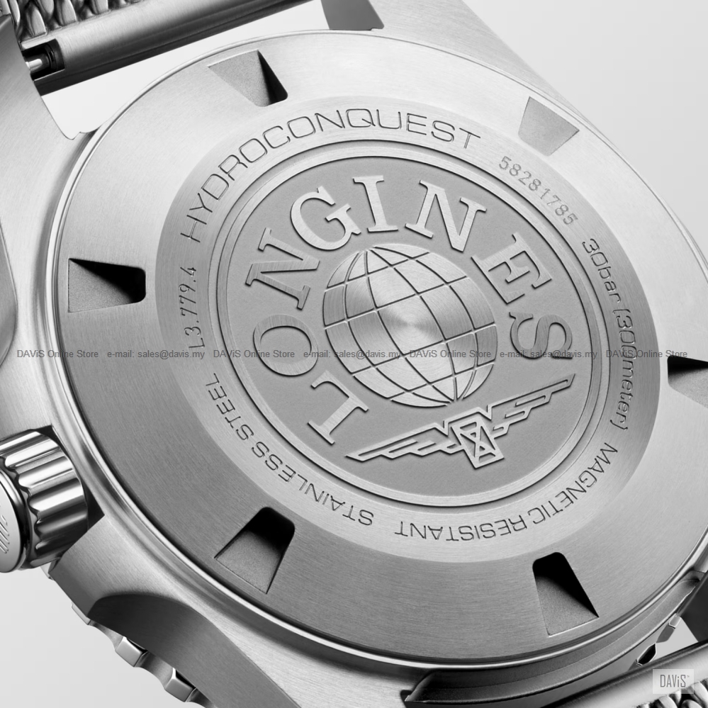 Product Description: The HYDROCONQUEST collection blends modern aesthetics with proven performance. Powered by an exclusive LONGINES automatic calibre, water-resistant up to 30 bar (300 m), with unidirectional bezel, screw-in crown and screw-down case back. Date, self-winding mechanical movement beating at 25'200 vibrations per hour, with a monocrystalline silicon balance-spring power reserve up to 72 hours. Screw-in crown unidirectional rotating bezel, water-resistant to 30 bar, scratch-resistant sapphire crystal, with several layers of anti-reflective coating on both sides. Frosted blue sunray dial, swiss super-luminova®. Stainless steel bracelet, with double security folding clasp with micro adjustment system. CASE Material Glass Case Back Dimension Lug distance Lug-to-lug Thickness Water Resistance Case Specificities Weight DIAL & HANDS Hour markers Hands Specificities MOVEMENT & FUNCTIONS Functions Caliber Movement Description STRAP Buckle GENERAL Warranty: