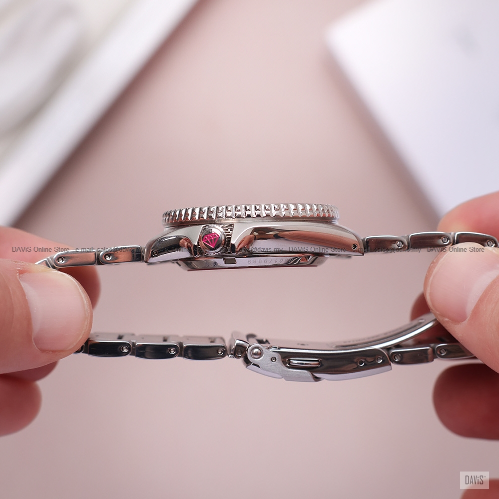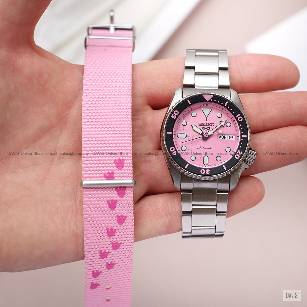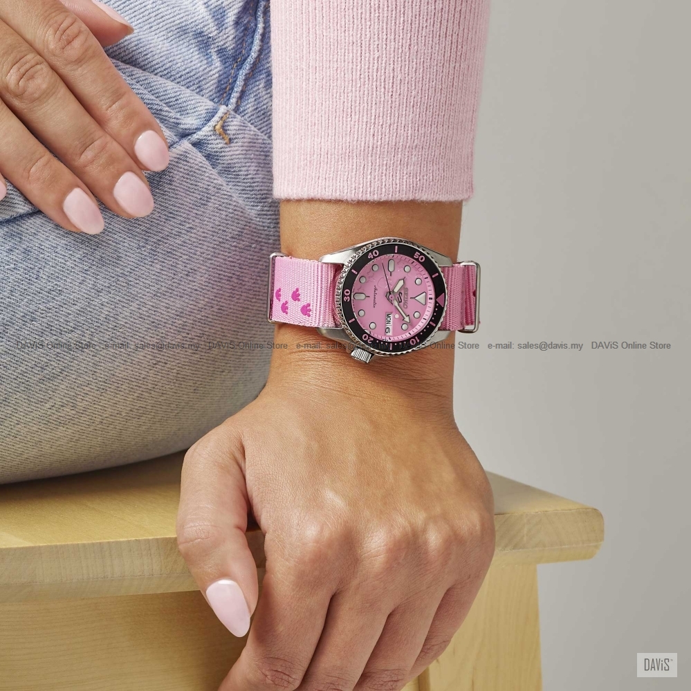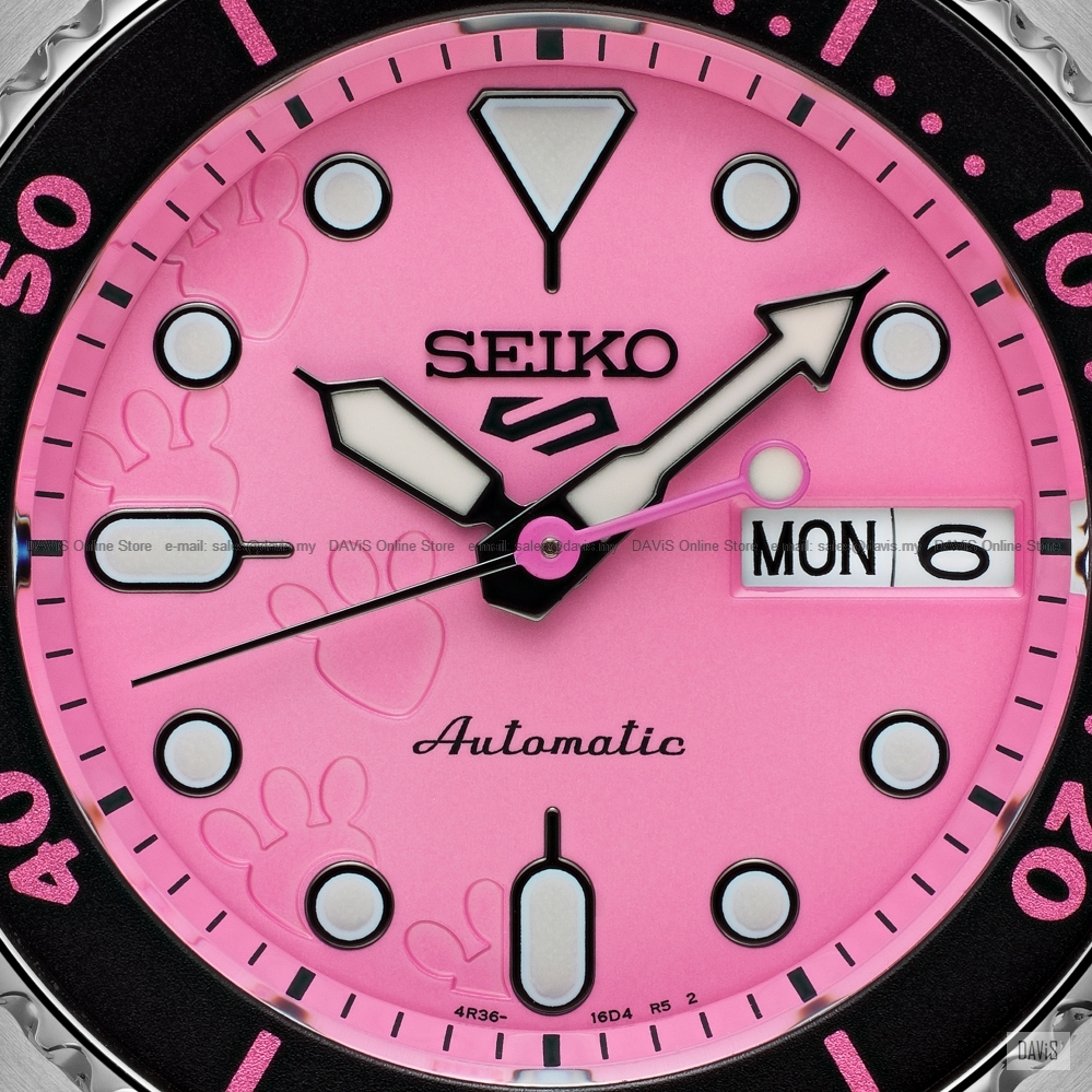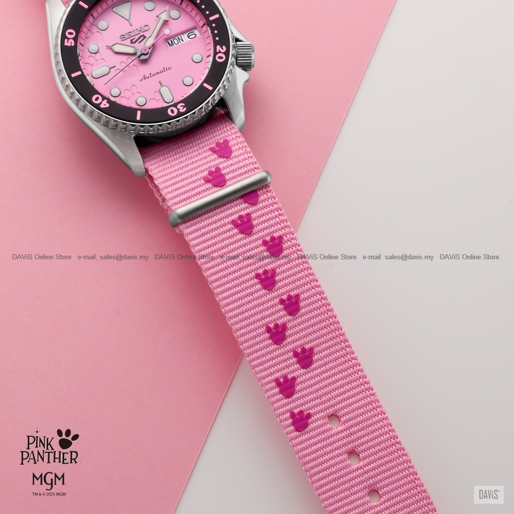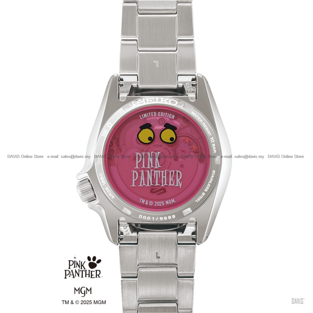 Pink Panther Limited Edition of 9,999 pieces Seiko 5 Sports meets the Pink Panther Based on the Seiko 5 Sports SKX series, this creation captures the world of the animated short comedy The Pink Phink. The story of the Pink Panther mischievously repainting the Little Man’s house in pink is reflected throughout the design, with the dial, bezel, and seconds hand accented in the character’s signature color. The dial also features the iconic footprints that lead the Little Man to discover the Pink Panther, adding a final accent that completes the playful and distinctive timepiece. An interchangeable nylon strap featuring the Pink Panther’s footprints is also included. Its tip is printed with the phrase “WET PAINT,” as seen in the original animation. The same font is used for the numerals on the bezel, capturing the playful essence of the animated classic down to the finest details. The case back features one of the most memorable scenes from the animation, with the Pink Panther hiding against a pink wall. Around the edge, the words “Limited Edition” and the individual serial number are engraved, highlighting the watch’s exclusivity. An original box inspired by the Little Man’s house being painted pink by the Pink Panther is included. The charming design depicts the playful battle between the Pink Panther and the Little Man. Specifications Movement Type Power reserve Jewels Functions Case/Band Case Size Crystal LumiBrite Clasp Distance between lugs Other Details Magnetic Resistance Weight Features * In an actual product, the case back direction might be different from the photograph. * All specifications and prices are subject to change without prior notice. Last Updated @ 30/12/2025 1:03:47 PM |